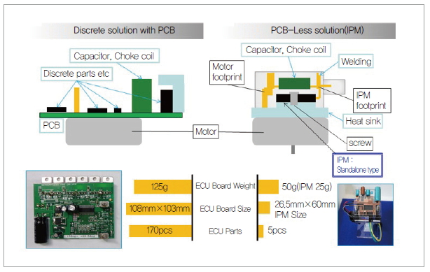 그림 5. PCB가 있는 별도 솔루션과 PCB가 없는 솔루션(IPM) 비교