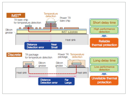 주목할 만한 IMST 기반 IPM의 첫 번째 장점은 고정밀 온도 탐지이다. 개별 소자 부품의 경우, 파워 트랜지스터 패키지와 온도 탐지 회로 패키지가 따로 떨어져 있으므로 온도 탐지 시간이 지연된다.
