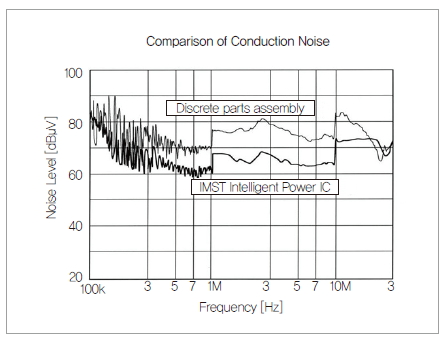 IMST 기반 IPM의 두 번째 이점은 노이즈 탄력성이다. 노이즈 억제는 차량 내 시스템의 필수 측면이므로 설계 엔지니어는 가급적 최대한 노이즈를 줄어야만 한다.