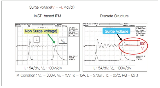 EMI노이즈는 설계 단계에서 중대한 문제에 속한다. 하지만 IMST 기반 IPM의 경우, 금속 기판의 알루미늄 시트 부분과 구리 호일 부분 사이 절연 수지를 통해 정전 용량이 분산된다. 이는 파워 소자의 스위칭 노이즈를 효과적으로 줄여주는 작용을 한다. 그림 7에 개별 소자의 구성과의 비교 데이터가 자세히 나와 있다.