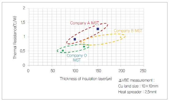 세 번째 이점은 금속 기반 디자인의 우수한 열 발산에 있다. 이 속성은 절연 소재 및 절연 층의 두께에 좌우된다. 절연 층이 두꺼울수록 열 저항을 줄일 수 있다. 그림 9를 보면 다중 절연 금속 기판의 절연 층 두께와 열 저항 값 관계를 알 수 있다.