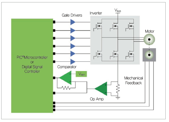 하나의 모터 시스템은 일반적으로 내장 플래시 메모리가 내장된 간단한 RISC 프로세서가 외부 MOSFET을 구동하는 게이트 드라이버를 제어할 수 있으며 내장 MOSFET과 함께 프로세서와 드라이버에 전원을 공급하는 전압 레귤레이터를 통해 직접 모터를 구동할 수도 있다.