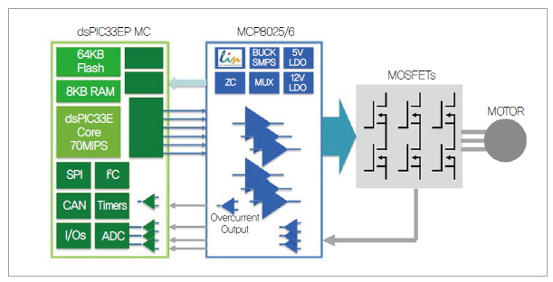그림 3은 브러시리스 모터의 일종인 영구자석 동기 모터(PMSM, Permanent-Magnet Synchronous Motor)의 FOC(Field Oriented Control)를 위해 6개의 N채널 MOSFET을 구동하는 고성능 디지털 신호 컨트롤러(DSC)와 다기능 3상 모터 드라이버를 결합한 2-칩 솔루션의 예를 나타낸다.