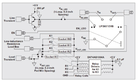 라인 과도현상이 필요하지 않는 테스트의 경우에는 일정 DC 전압이 라인 과도현상 입력을 통해 제공되는데, 이것은 LDO의 입력에 연결되어 있다. 함수 제너레이터를 사용하는 스타트업 테스트의 경우, 이네이블(EN) 입력을 이용해 펄스를 제공할 수 있다.