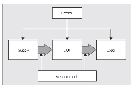 자동 테스트 플랫폼을 위한 테스트 환경의 블록 다이어그램을 그림 10에 나타냈다. 공급장치 블록은 모든 전압 입력과 라인 과도현상 입력을 DUT에 제공하며, 부하 블록은 릴레이로 제어되는 여러 저항식 부하를 제공한다. 그리고 컨트롤 블록은 DUT와 연결을 담당하며, 공급장치 및 부하 설정 변경도 함께 담당한다. 측정 블록은 입/출력 전압 및 전력의 측정을 맡는다.