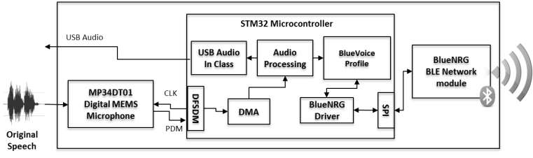 또한 STM32L4를 특별히 선택한 것은 이 마이크로컨트롤러가 저전력 기능이 뛰어나고 시그마-델타 변조기(DFSDM) 주변장치를 위한 온보드 디지털 필터를 제공하므로 그림 4에서 말한 PDM 대 PCM 변환 필터를 구현할 수 있기 때문이다. 이러한 기능들은 BlueVoice 애플리케이션에 매우 적합하다.
