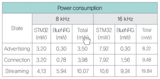 위와 같이 BlueVoice 애플리케이션을 실제 하드웨어로 구현했다. 이 하드웨어는 호스트 디바이스로 동작하는 STMicroelectronics STM32 Nucleo 보드와 컨트롤러 디바이스로 동작하는 블루투스 LE 네트워크 모듈로 이루어진다. 표 1에서는 BlueVoice 주변장치 모듈이 동작할 수 있는 3가지 상태(애드버타이징, 접속, 스트리밍)로 호스트와 컨트롤러 디바이스(STM32와 BlueNRG)의 전력 소모를 보여준다. 8kHz와 16kHz 구성을 비교하고 있으며, 3.3V로 동작하면서 측정한 것이다.