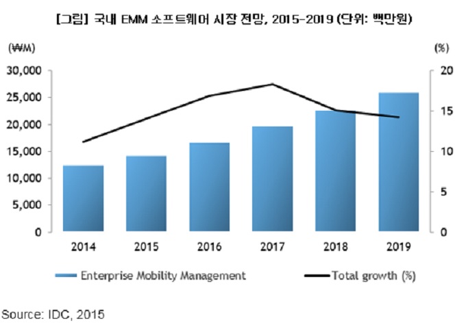 시장조사기관인 한국IDC(대표:홍유숙, http://www.kr.idc.asia)의 최근 보고서('Korea Enterprise Mobility Management Software Forecast, 2015-2019')에 의하면, BYOD 트랜드 강세와 기업의 모빌리티 활용이 늘면서 2015년 국내 EMM(엔터프라이즈 모빌리티 매니지먼트) 소프트웨어 시장이 전년대비 14.1% 성장한 143억 원을 기록할 것으로 잠정 집계되었다. 또한, 이 시장은 2019년까지 연평균(CAGR) 15.7%씩 성장해 2019년 260억 원 규모를 형성할 것으로 전망된다.