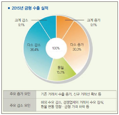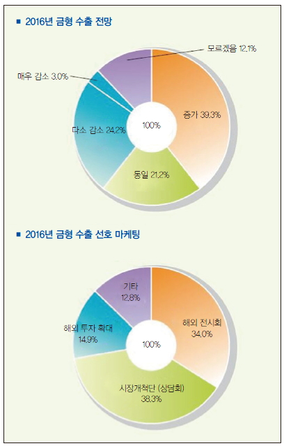 이번 실태조사에 참여한 조합원사들은 보통 경기 악화 속에서도 새해 목표 달성에 대한 의지, 지속된 경기 부진의 반등 기대심리가 복합적으로 반영되어 2016년에는 소폭이나마 수출이 증가할 것으로 전망하였다.