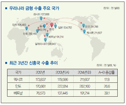 금형조합이 2015년 수출을 분석한 결과 전년대비 수출 감소분은 대부분 일본 수출 감소 영향으로 나타나, 일본 지역 외의 신흥지역 개척이 향후 국내 금형산업의 지속 성장을 좌우할 것으로 보인다.