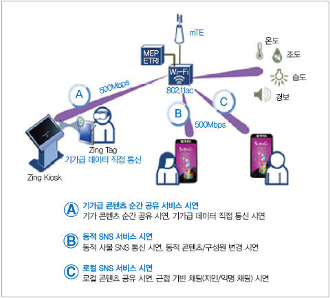 이 미래 SNS 서비스는 ETRI 연구원 캠퍼스 내에 설치된 초고속 이동 무선 백홀 기술인 MHN(Mobile Hot-spot Network), 기가급 순간근접통신 기술인 Zing, 그리고 모바일 에지 서비스 플랫폼 기술인 MEP(Mobile Edge Service Platform) 기술을 서로 연계해 차량으로 이동하면서 시연에 성공했다.