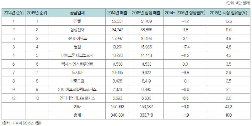 국내 업체로는 삼성전자가 메모리 사업을 앞세워 11.8%의 성장률을 기록했고, 이를 통해 11.6%의 시장 점유율을 차지하며 2위 자리를 유지했다. 또 SK 하이닉스는 2014년 15,997억 달러 대비 3.1% 성장한 16,494억 달러의 매출을 기록했다. 이로 인해 2014년 매출액 순위 5위에서 3위로 올랐으며, 총 반도체 시장의 4.9%를 점유하게 됐다.