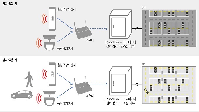 쏠라사이언스에 따르면, 사람이나 차량의 움직임을 감지할 수 있는 무선 센서가 장착된 이 시스템은 주차장 출입구 및 주요 동선에 설치돼 구역별로 자동으로 전력을 제어하는 기능을 제공한다. 운영 방식은 분전함과 인터넷 사이에 설치된 별도의 허브(Coordinator)에 데이터를 전송하고, 스마트폰이나 관제서버를 통해 직접제어 또는 모니터링하는 방식이다.