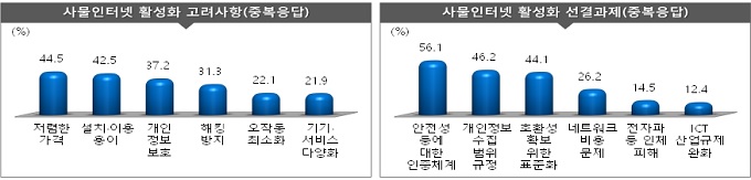 우선, 사물인터넷(IoT) 활성화를 위해서는 ‘저렴한 가격(44.5%)‘과 ’설치·이용 용이(42.5%)‘ 등을 우선 고려하는 것이 필요하며, 이를 위한 선결과제는 ‘안전성 등에 대한 인증체계(56.1%)’, ‘개인정보 수집범위 규정(46.2%)’, ‘호환성 확보를 위한 표준화(44.1%) 등인 것으로 조사됐다.