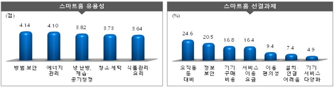 스마트홈에 대해서는 ‘방범 및 보안(4.14점)’, ‘에너지 관리(4.10점)’ 등의 분야가 가장 유용할 것으로 기대되는 반면, ‘오작동(24.6%)’, ‘정보보안(20.5%)’ 등이 선결돼야 하는 것으로 나타났다.