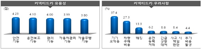 커넥티드카는 ‘안전기능(4.23점)’과 ‘운전보조기능(4.10점)’이 가장 유용할 것으로 평가하였으며, ‘오작동(37.4%)’, ‘구매비용(27.3%)’ 등을 우려하고 있는 것으로 조사됐다.