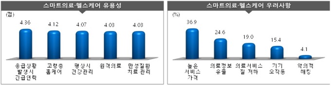 스마트의료·헬스케어는 ‘응급의료상황 긴급연락(4.36점)’, ‘고령층 홈케어(4.12점)’ 등에 유용할 것으로 조사된 반면, ‘높은 서비스 가격(36.9%)’, ‘의료정보 유출(24.6%)’ 등을 우려하는 것으로 나타났다.