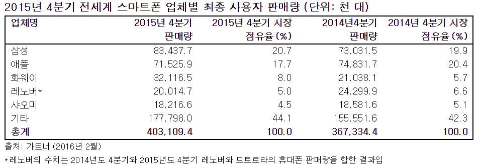 상위 5대 기업 중 2015년 4분기에 성장한 업체는 삼성과 화웨이였다(아래 표 참고). 2015년 4분기에 애플의 스마트폰 판매량은 4.4% 감소하며 사상 처음으로 하락했다.