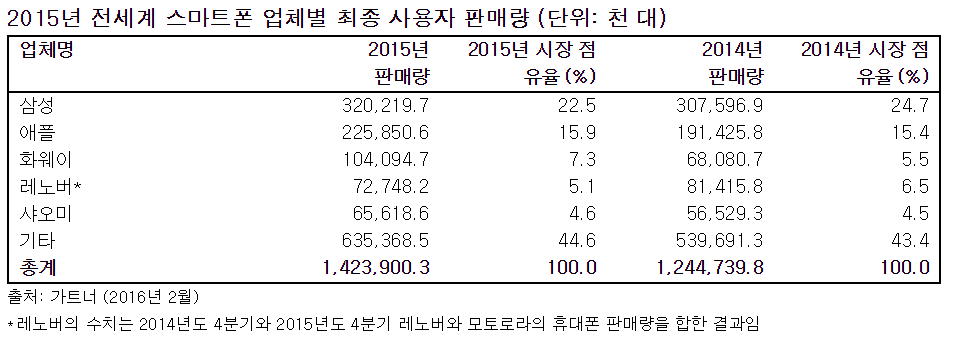 삼성은 2015년 스마트폰 총 판매량에서 1위 자리를 유지했지만 시장 점유율은 2% 포인트 감소했다(아래 표 참고). 2015년 애플의 스마트폰 판매량은 2억2천590만대로 16%의 점유율을 기록했다. 화웨이는 전년도 대비 53% 증가한 1억4백만 대의 스마트폰 판매량을 기록했다.