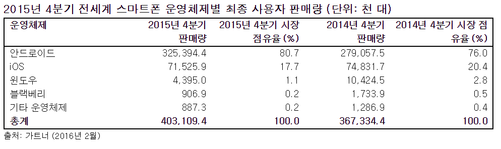 2015년 4분기 스마트폰 운영체제(OS) 시장은 안드로이드가 16.6% 증가하면서 전세계 시장의 80.7%를 차지했다(아래 표 참고).