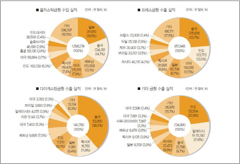 이와 함께 우리나라 금형 수출에서 33.6%의 비중을 차지하는 프레스금형 수출도 0.8% 감소한 9억5,194만 달러를 기록했으며, 다이캐스팅금형도 전년대비 9.1% 하락했다. 기타 금형은 말레이시아 수출이 14.4% 신장하고 멕시코 수출이 증가했으나, 중국, 러시아 등 주요 국가들이 하락함에 따라 17.4%의 하락세를 보였다.