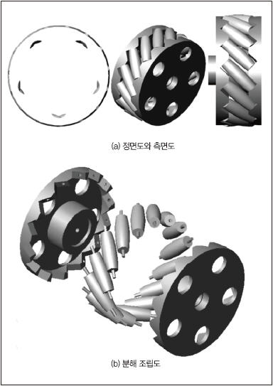 이때 메카넘 휠이 불연속적인 충격 없이 자연스럽게 회전하기 위해서는 메카넘 휠을 축 방향에서 바라볼 때 휠의 둘레가 완전한 원을 이루도록 림 휠과 자유 롤러들이 그림 2(a)와 그림 3과 같은 형태로 설계되어야 한다. 그림 4는 림 휠과 자유 롤러를 3차원 축을 중심으로 더욱 상세하게 나타낸 것이다.