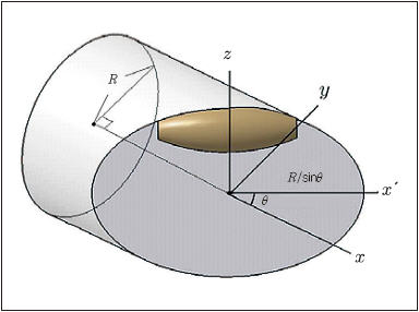 그림 4에서 x축은 메카넘 휠의 회전축이며, x'축은 롤러의 회전축으로 휠의 회전축 x축과 θ의 각도를 이루고 있다. 이로 인해 메카넘 휠의 바깥 면이 완벽한 원을 이루기 위해서는 그림 5와 같이 자유 롤러의 외곽이 타원의 형태로 설계되어야 한다.