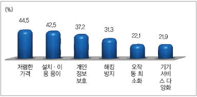 스마트홈(*)에 대해서는 방범 및 보안(4.14점), 에너지 관리(4.10점) 등의 분야가 가장 유용할 것으로 기대되는 반면 오작동(24.6%), 정보보안(20.5%) 등이 선결돼야 하는 것으로 나타났다.