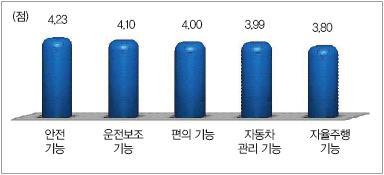 커넥티드카(*)는 안전기능(4.23점)과 운전보조기능(4.10점)이 가장 유용할 것으로 평가했으며, 오작동(37.4%), 구매비용(27.3%) 등을 우려하고 있는 것으로 조사됐다.