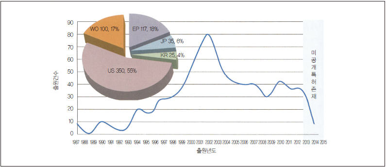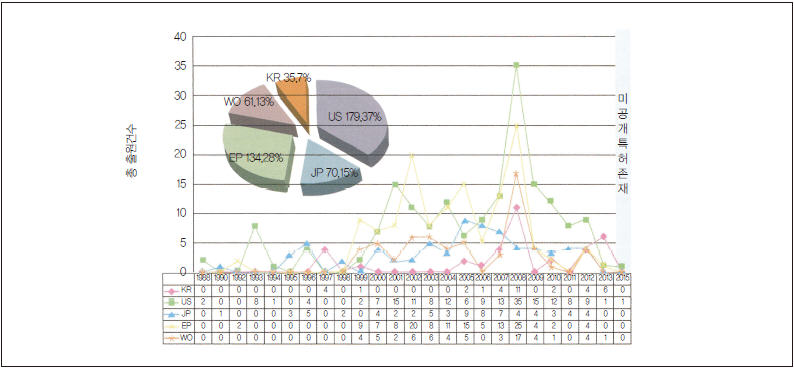 국가별 출원에서는 한국의 경우 2000년대 들어서면서 매년 특허출원이 꾸준히 이루어지고 있으나 출원량은 미국이나 유럽에 비해 미비한 상태이다.