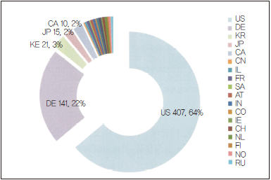 국가별 점유율을 살펴보면, 미국이 350건(55%)로 전체 특허 출원량의 절반 이상을 차지하고 있으며, 그다음으로 유럽 117건(18%), PCT 109건(17%), 일본 35건(6%), 한국 25건(4%) 순으로 나타났다.