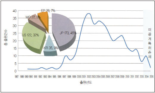 국가별로 살펴보면, 일본이 173건(45%)으로 전체 특허 출원량의 절반 가까운 특허를 보유하고 있으며, 그다음으로는 미국이 122건(32%)의 특허 출원량을 보였다. 한국, 유럽 및 PCT의 경우 9~7%의 대동소이한 특허 점유율을 나타냈다.