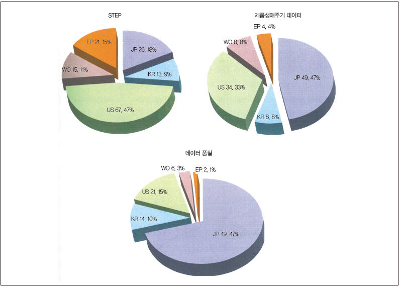 또한, 위 3개 기술 분야의 국가별 특허출원 동향을 보면, STEP은 미국이 67건(47%)으로 가장 높은 특허 점유율을 보이며, 그다음으로 일본이 26건(18%), 유럽이 21건(15%), PCT가 15건(11%)의 점유율을 나타냈고 한국은 13건(9%)으로 가장 낮은 점유율을 보였다. 데이터 품질/신뢰성 기술 분야는 일본이 98건(71%), 그다음으로 미국과 한국이 비슷하게 21건(15%), 14건(10%)의 점유율을 보이고 있으며, PCT와 EP가 3%, 1%의 낮은 점유율을 나타냈다. 이 기술 관련해서는 일본이 절반이 넘는 높은 점유율로 타 국가에 비해 기술 관심도가 매우 높다고 예상할 수 있으며 기술 장벽 역시 높은 것으로 예상된다. 제품생애주기 데이터 기술 분야 역시 일본이 49건(47%)로 가장 높은 특허 점유율을 보이고 있으며, 그다음으로는 미국이 34건(33%), 한국과 PCT가 8건(8%), 유럽이 4건(4%)로의 출원 점유율을 나타냈다. 이 기술 또한 일본이 상대적으로 높은 기술 우위와 R&D 투자가 이루어지는 것으로 분석된다.