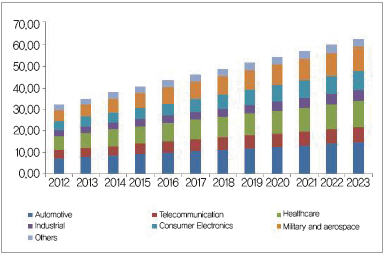 글로벌 임베디드 시스템 시장이 가파르게 성장할 것으로 보인다. 시장조사기관인 Radiant Insights가 발표한 보고서에 따르면, 2013년 1,403.2억 달러였던 이 시장은 연간 5.6%씩 성장하면서 2023년에는 2,587.2억 달러에 이를 전망이다(그림 1). 이러한 성장 배경에는 최근 출현한 사물인터넷에 힘입어 자동차와 의료 분야에서 임베디드 시스템에 대한 수요가 급증할 것으로 전망되기 때문이다. 보고서는 이 두 산업이 향후 임베디드 시스템 시장의 성장을 견인할 것으로 내다봤다.