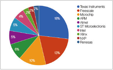 임베디드 시스템이 다양한 산업 분야로 확대됨에 따라 프로세서는 더욱 중요해졌다. 이 시장에서 프로세서 공급업체 간의 경쟁도 치열하다. (그림 3)을 보면, 텍사스 인스트루먼트(TI), 프리스케일, 그리고 마이크로칩이 임베디드 시스템 프로세서 시장의 거의 50% 이상을 차지하는 것을 볼 수 있다. 왜냐하면 이들 기업들이 공급하고 있는 다양한 프로세서들 때문에 점유율이 높다는 분석이다. 일례로, TI는 약 230여 종의 프로세서를 판매하고 있는 반면, 10여종을 판매하고 있는 기업도 있다. 따라서 임베디드 프로세서 분야에서 경쟁 우위를 갖기 위해서는 구매자의 특정 요구를 충족시킬 수 있는 폭넓은 다양성을 갖춰야 한다.