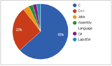 임베디드 시스템의 프로그래밍 언어 시장은 오픈소스 언어가 지배하고 있다. (그림 4)에서 보듯, C/C++ 언어가 여전히 임베디드 시스템 시장에서 78% 이상을 차지하고 있다. 오픈 소스가 아닌 LavBIEW, MATLAB, .NET은 임베디드 산업에서 차별화된 기능을 가지고 조금씩 영향력을 확대해 나가고 있는 언어들이다.