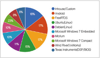 임베디드 프로그래밍 언어 시장과 유사하게 임베디드 시스템의 운영체제 분야도 크게는 오픈 소스가 우위를 점하고 있다. (그림 5)에서 보는 바와 같이 임베디드 시스템을 구현하기 위해 기업에서 공급하고 있는 운영체제를 구매하는 경우는 아주 드물다. 그 중에서도 마이크로소프트, 윈드 리버, Micrium, TI가 상업용 시장을 선도하고 있다. 그러나 모든 상업용 운영체제는 전체 운영체제 시장의 약 35%를 차지하는 반면, 오픈 소스 실시간 운영체제가 65%를 점유하고 있다.
