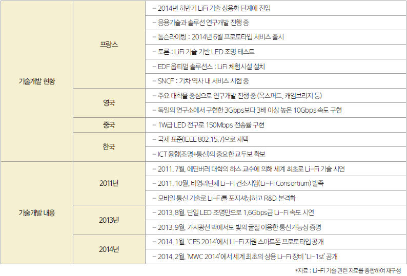프랑스/영국/중국/한국 등 Li-Fi 기술 선도국가의 기술개발 현황과 최근(2011~14년)의 Li-Fi 기술개발 내용을 <표 1>에 나타낸다.