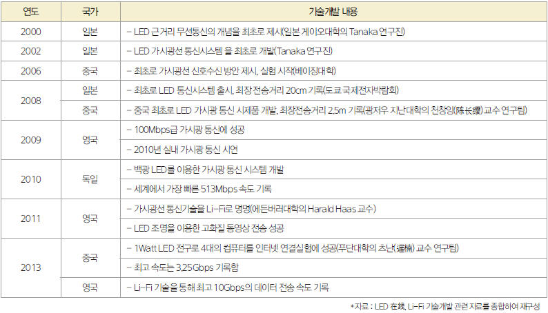 2000년 일본의 게이오대학의 Tanaka 연구진은 LED 조명기술을 이용한 근거리 무선통신의 개념을 최초로 제시하였으며, 2013년 영국에서는 Li-Fi 네트워크를 통해 최고 10Gbps의 데이터 전송속도를 기록하기도 했다.