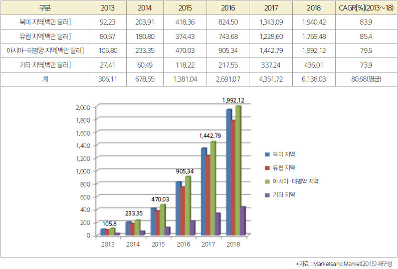 2013~18년까지 각 지역별 연평균 성장률을 보면 북미 지역이 연평균 83.9%, 유럽 지역이 85.4%, 아시아-태평양 지역이 79.5%, 기타 지역이 73.9%를 기록할 것으로 예상하고 있다. 특히 아시아-태평양 지역의 시장 규모가 글로벌 시장에서 강세를 보이고 있는 것으로 나타났다[8]