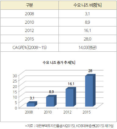 이에 Li-Fi 기술 시장 성장과 Li-Fi 기술 확산에 따른 수요 니즈 비중 전망치를 보면 2008년 3.1%, 2010년 8.9%, 2012년 16.1%에서 2015년에는 28.0%로 지속적인 증가추세를 기록하고 있다4)[10]. 2008~2015년까지 Li-Fi 기술 확산에 따른 수요니즈 증가현황을 <표 5>에 나타낸다.