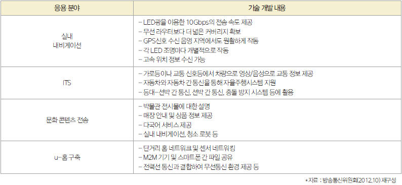 LED 조명기술 기반의 가시광통신(VLC) 기술을 이용한 Li-Fi 시스템은 실내 내비게이션, 지능형 교통시스템, 문화콘텐츠 전송 및 u-홈 구축 등 다양한 산업 분야에 응용되면서 그 가치를 확산시켜가고 있다.