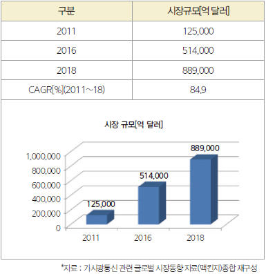 VLC 전후방 기술 관련 글로벌 시장 규모는 2011년 12조5,000억 달러에서 연평균 84.9%의 고속 성장을 지속하여 2018년에는 88조9,000억 달러의 초대규모 시장을 형성할 것으로 예상하고 있다[13].
