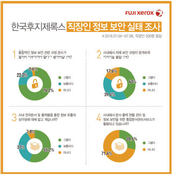 정보보호의 날을 맞이해 직장인들의 정보보안 인식과 실태에 대한 설문조사 결과가 발표돼 화제가 되고 있다. 한국후지제록스가 최근 직장인들의 정보보안 인식과 실태에 대한 설문조사를 실시한 결과, 직장인 10명 중 7명은 보안 규정을 철저히 지켜야 한다고 생각하고 있으나 실제 보안 규정이 제대로 지켜지는 기업은 절반에도 미치지 못하는 것으로 나타났다.