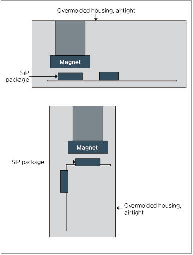 SiP 패키지 기술은 MPOS 솔루션이 최종 제품 내에 탑재되기 때문에 애플리케이션의 견고성과 성능면에서 중요한 장점을 갖는다. 그러나 PCB와 함께 구성되는 위치 감지 회로는 완벽하게 밀폐되지 않는다. PCB와 실장(hosing)이 애플리케이션에 대해 개별적인 부품들이기 때문에, 일반적으로 실장은 몰딩되고, PCB를 별도의 유닛으로 실장 커버로 연결된다(그림 2 참조). 따라서 생산 라인에서 커버와 실장, 이 두 개의 부품을 서로 붙여야 한다.