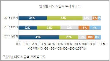 2016년 상반기에는 58.8Gbps에 이르는 디도스 공격이 관찰되어 분석 기간 내 최대 공격 트래픽을 기록했다. 전년 동기 최대 공격 트래픽인 21Gbps 대비 공격 규모가 2.8배 증가했다. 또한 탐지와 대응이 어려운 소규모 GET flooding 공격의 증가로 전체 공격 건수 중 20G 이상 공격 비율은 감소했으나, 50G를 초과하는 공격 비율은 지난해 같은 기간 0%에서 31%로 대폭 증가했다.