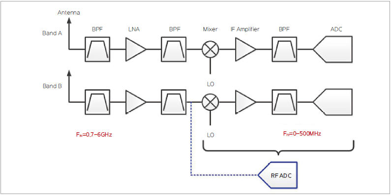 ▲ 그림 1. 하나의 RF 샘플링 ADC(analog-to-digital converter)가 여러 IF 샘플링 시그널 체인을 대체할 수 있다.