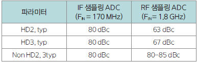 ▲ 표 2. IF 및 RF 샘플링 데이터 컨버터의 SFDR (Spurious-free dynamic range) 성능