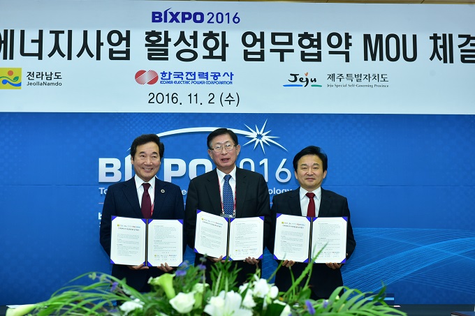 한국전력(사장 조환익)은 BIXPO 개최 첫날인 이달 2일, 김대중컨벤션센터에서 전라남도 및 제주특별자치도와 신재생에너지사업 활성화를 위해서 업무협약 양해각서를 체결했다.