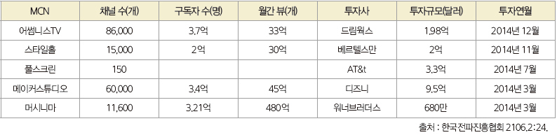 ▲ 표 1. 2016년 2월, 미국 MCN 정보 및 투자 현황
